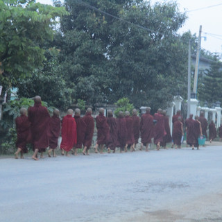 A la fin du marché (vers 6h du matin) les moines viennent demander l' aumône dans tout le village. On peut observer des dizaines de files indiennes venant des différentes pagodes autour du village.